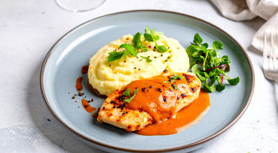 Pechuga en salsa napolitana con puré de plátano y vegetales – Friko 🍅🍌