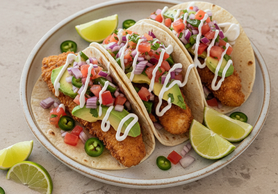 Rocía Deditos de pescado Alaska Antillana con un poco de aceite en spray y cocínalo en la freidora de aire hasta que esté dorado y crujiente. Calienta las tortillas y arma los tacos colocando el pescado en el centro, seguido del pico de gallo. Añade trozos de aguacate, un toque de crema agria y sirve con rodajas de limón para aportar acidez y frescura.