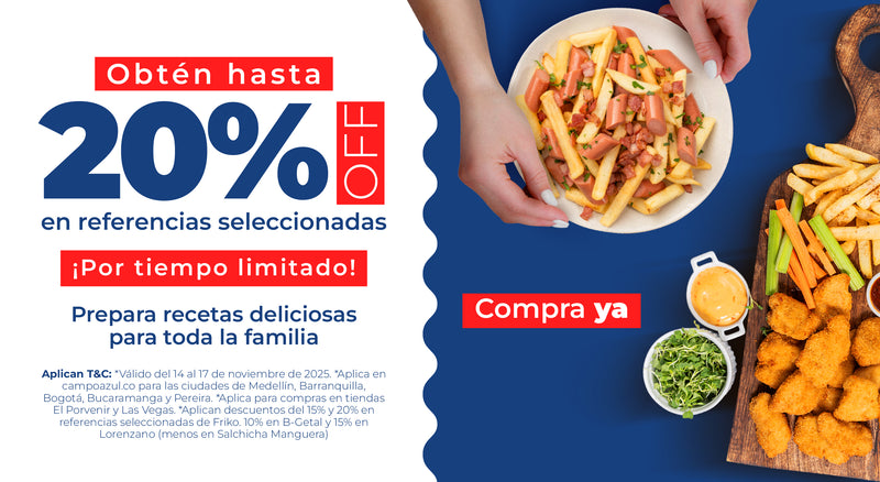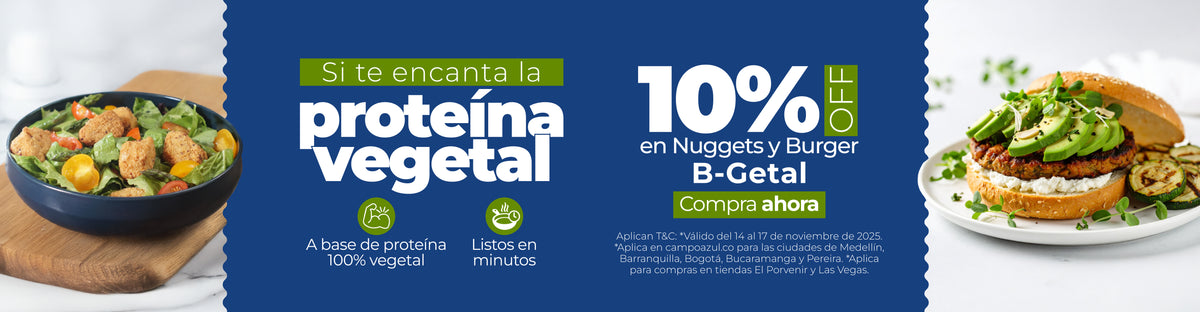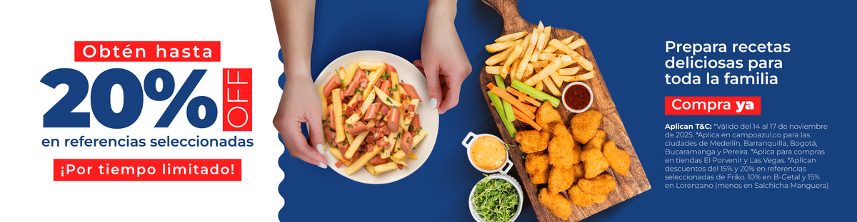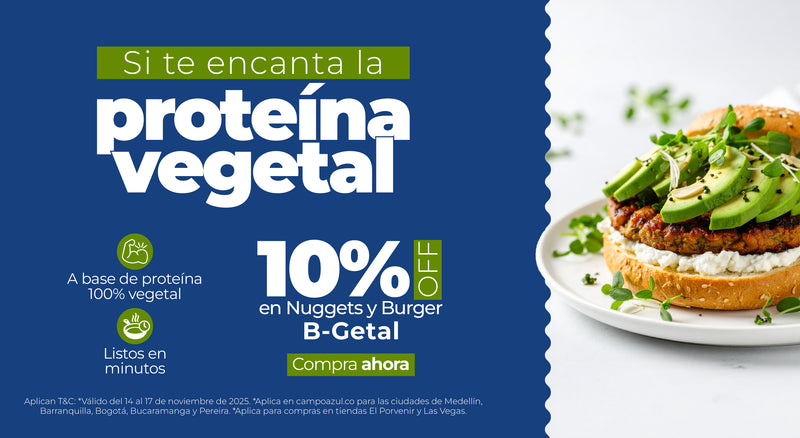Campo Azul es una tienda multiproteína en la que podrás encontrar productos como pollo, carnes frías, proteína vegetal, cortes de carne de cerdo, pescados y mariscos, ideales para incluir en tus recetas diarias. ¡Y lo mejor! No te pierdas todas las ofertas y descuentos que tenemos para ti.