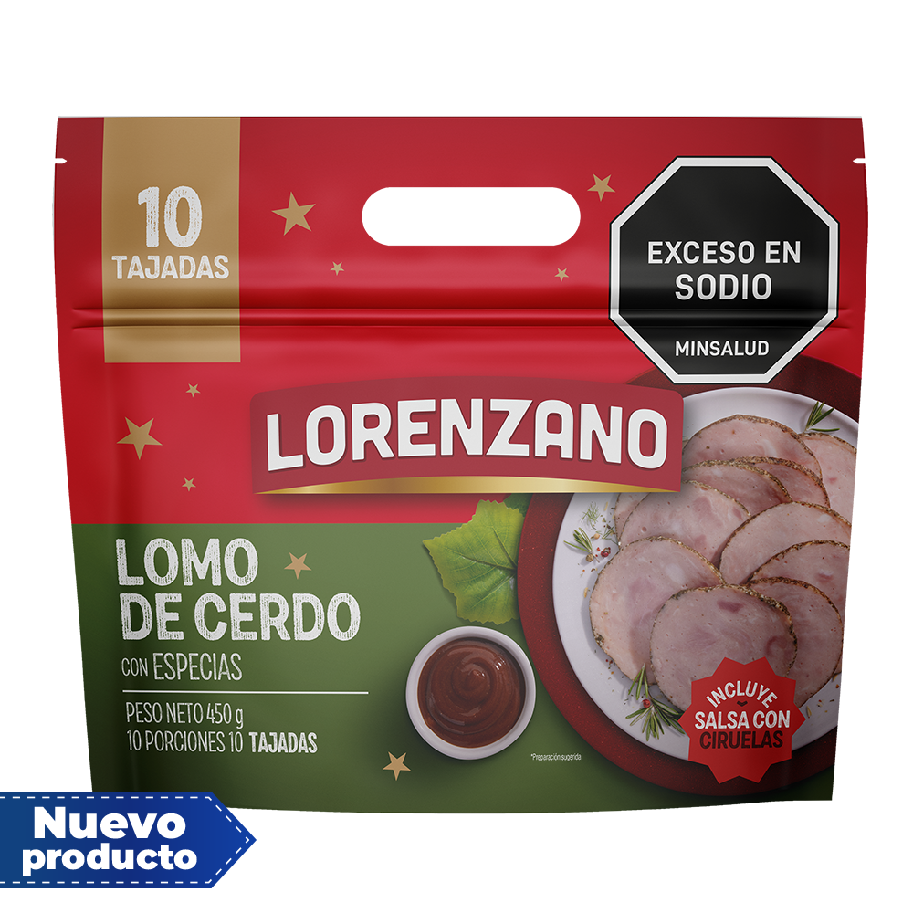 Prueba el Lomo de Cerdo Ahumado con Especias x 450g, versátil y perfecto para tus recetas navideñas. Elaborado con cortes seleccionados de pierna de cerdo y recubierto con apio, ajo, tomillo, romero y un toque de menta. Además, incluye una salsa de ciruela que realza su sabor. Es un producto listo para consumir frío o caliente. Mantener refrigerado entre 0°C y 4°C.