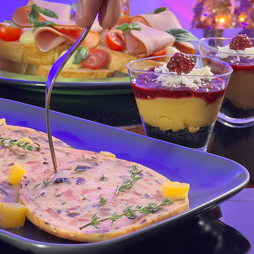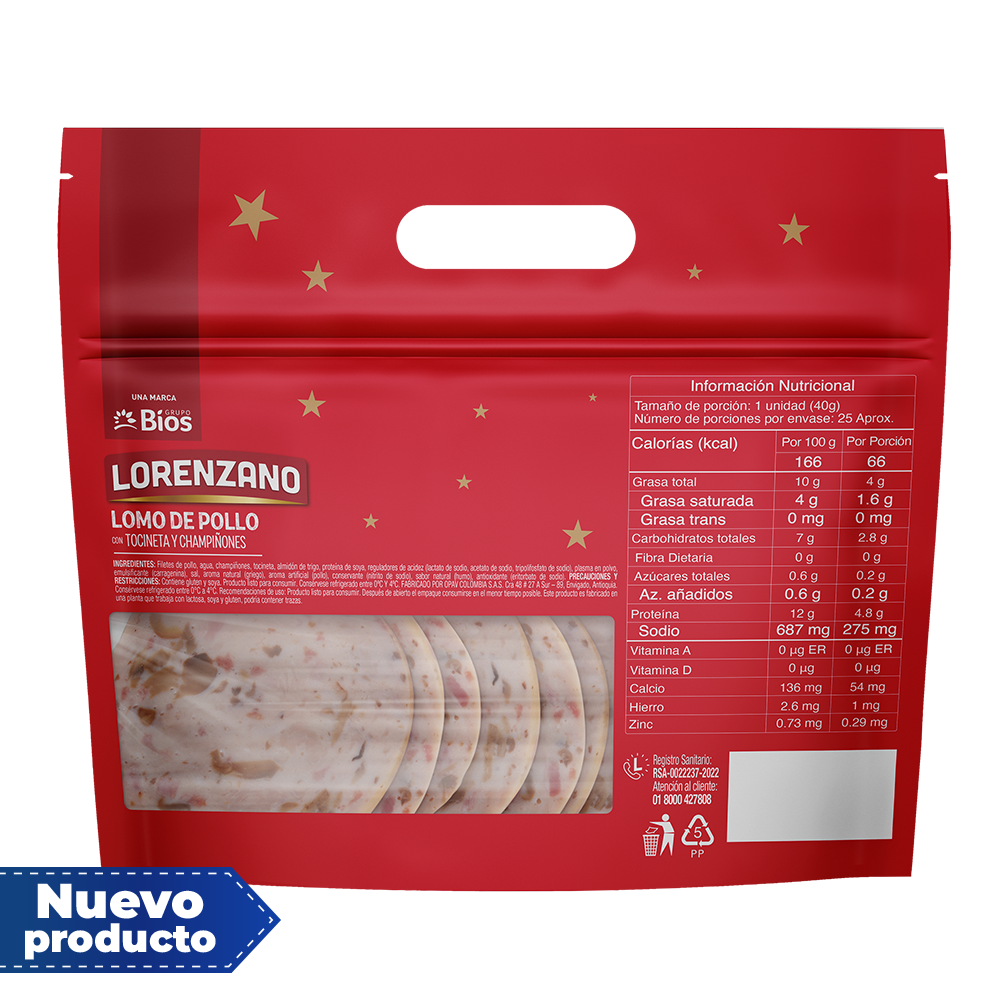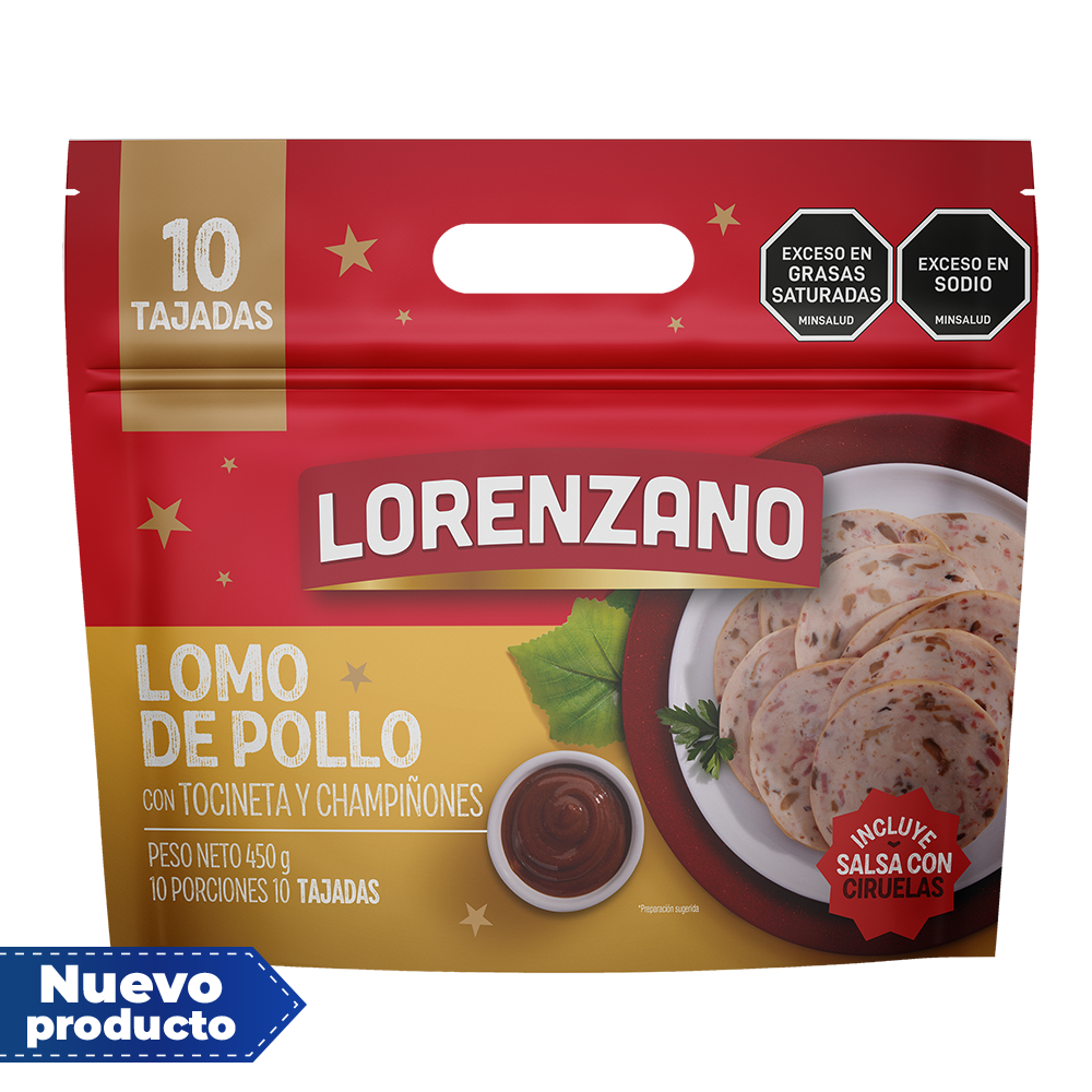 Disfruta el delicioso Lomo de Pollo con trozos de champiñones y tocineta. Con un delicioso toque ahumado y elaborado con filete de pechuga y contramuslo. Perfecto para sorprender y compartir en esta Navidad con recetas gourmet . Incluye una salsa de ciruela para acompañarlo y es un producto listo para consumir frío o caliente. Mantener refrigerado entre 0°C y 4°C.