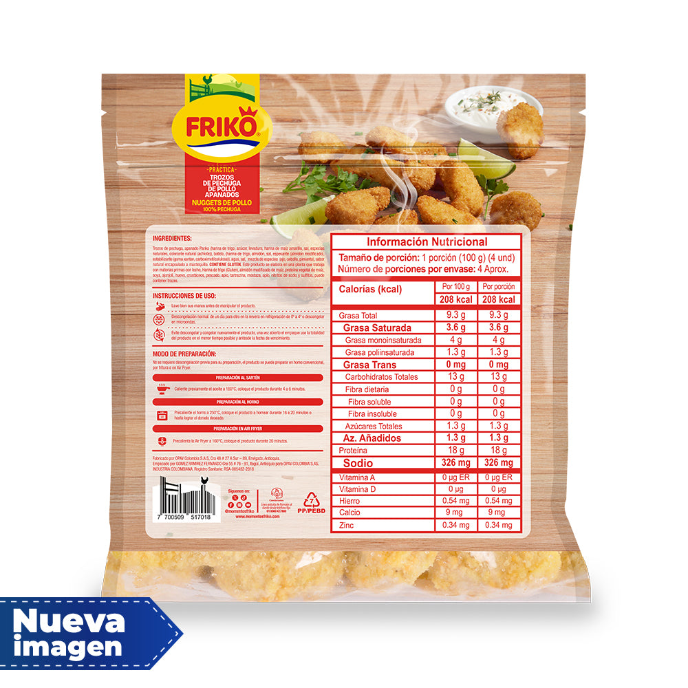 Los Trozos de Pechuga Apanados Friko combinan la suavidad de la 100% pechuga de pollo con el toque crocante del apanado panko. Su formato práctico los hace ideales para snacks, loncheras o cenas ligeras, listos en minutos en freidora de aire o horno.